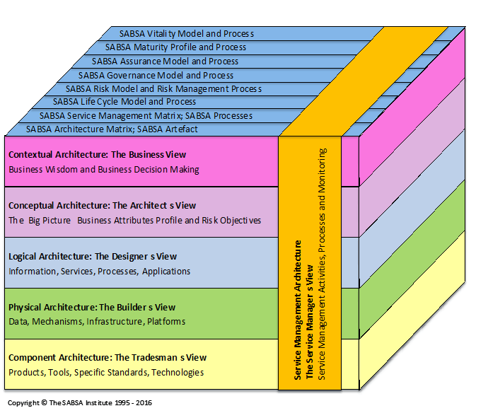 The SABSA story now spans 21 years and has had many pivotal turning points along the way. What you see today is the result of much work and input from many different sources. In the next blog article, I shall track that development path that took SABSA from these early beginnings to the present day. Figure 3 shows just how far this original model had evolved, with multiple backplanes of overlaid additional models and frameworks. The layers are now considered as ‘views’ according to the roles and ‘viewpoints’ of the leading role-players at each layer.